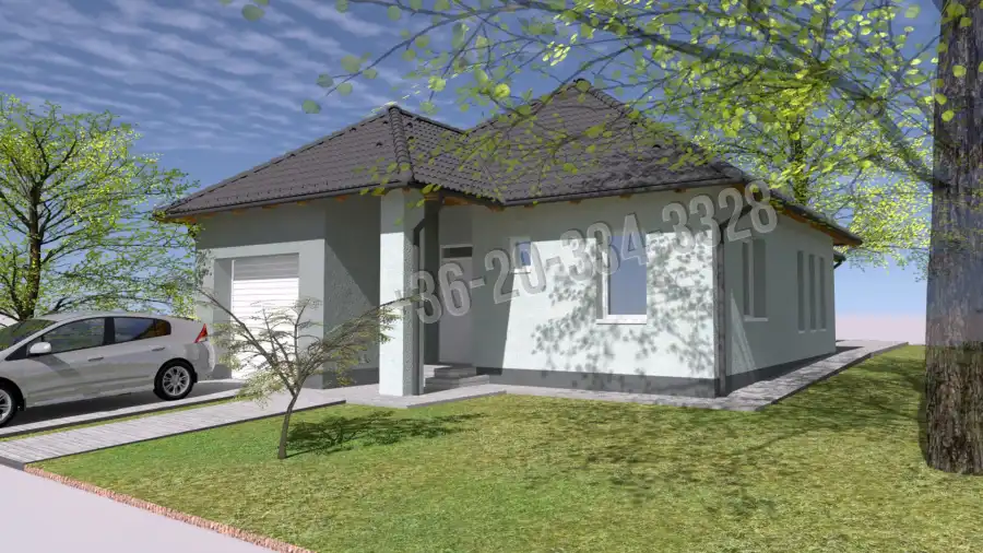 -42 nm-es amerikai konyhás nappali, kamra, 4 szoba, fürdőszoba, mosókonyha, vendég WC, előszoba-közlekedő, garázs.